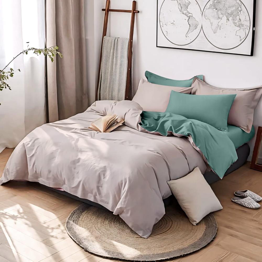 أضف لمسة من الحيوية والأناقة إلى غرفة نومك مع طقم المفرش المزدوج الألوان العصري. يتميز المفرش بتناسق بين اللون البيج الفاتح واللون الأخضر الزاهي، مما يعزز من جمالية المكان ويمنحك تجربة نوم مريحة ومميزة. بفضل نعومة خامته المصنوعة من القطن عالي الجودة، يضمن لك الطقم إحساساً بالراحة والاسترخاء طوال الليل.